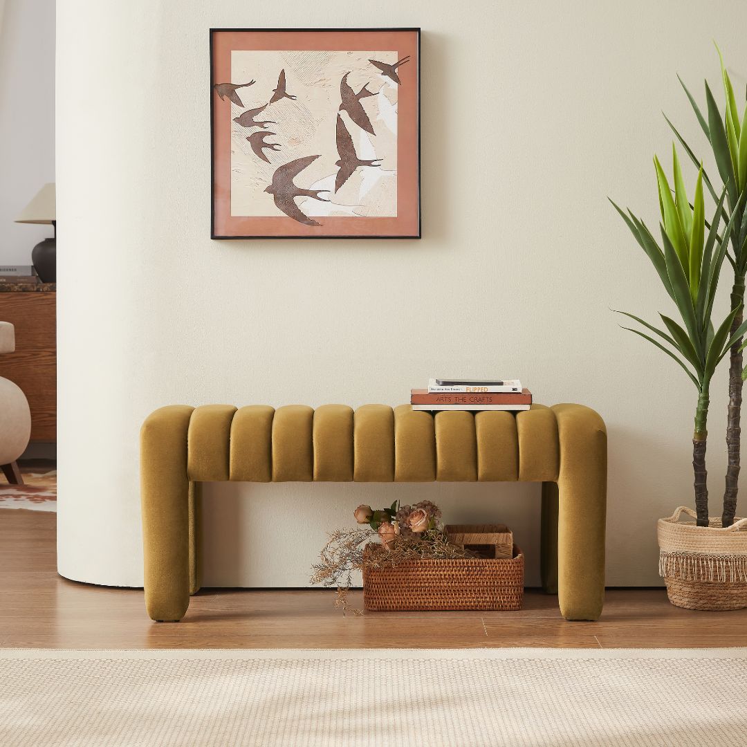 The Tobi Bench features sculptural, vertical channelling from top to bottom, giving it a structured yet padded appearance that instantly draws the eye. This meticulous detailing creates visual interest while enhancing the plush feel of the seat, making it not only stylish but invitingly tactile.