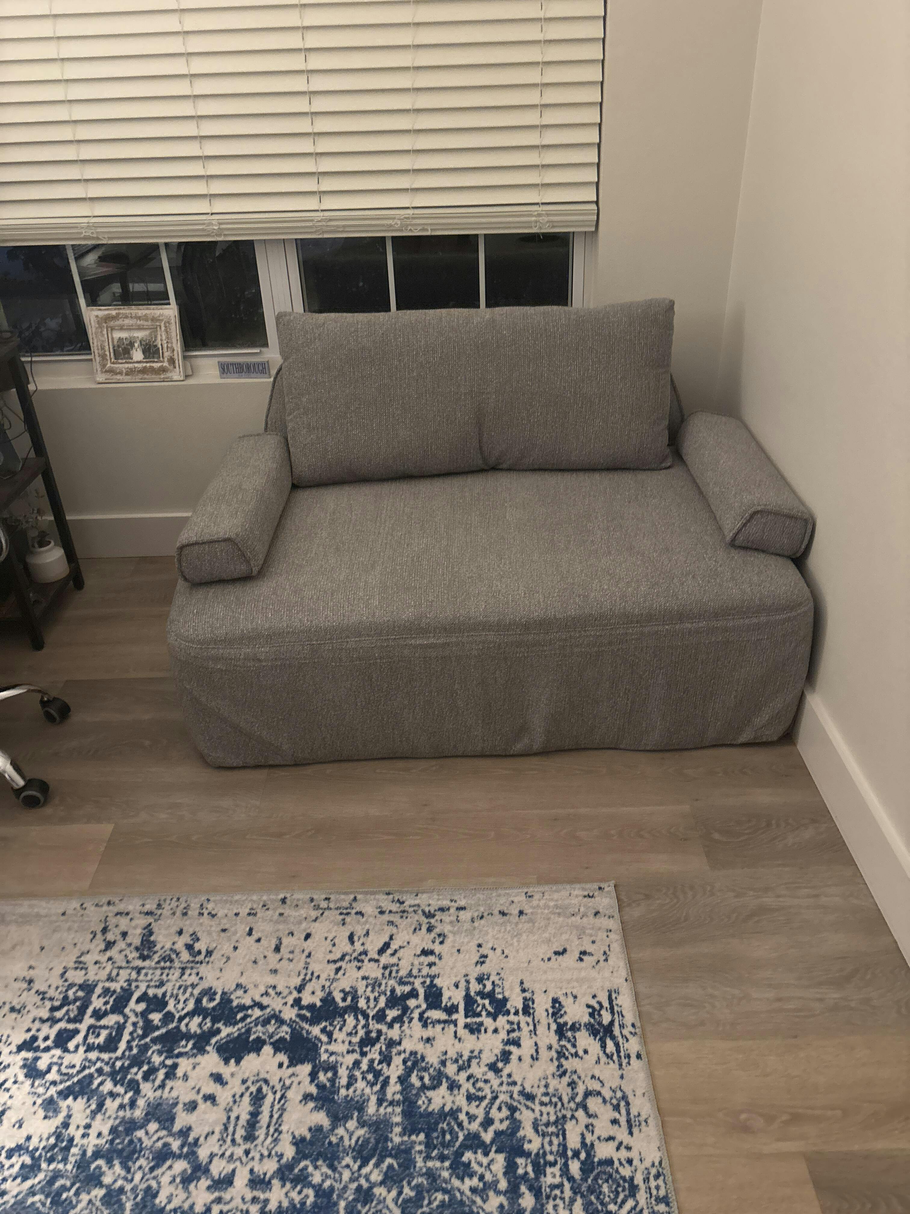 I ordered this for my son’s bedroom so he’d have an option to have sleepovers. It also serves as an oversized comfy reading chair as well. When I unfolded it into a twin bed and tested it out I found it to be very comfortable. The nightfall color is not solid like it appears in the website photos, it has a touch of light gray flecks to it too, but I like how it looks and think it will wear very well. The only part I don’t like is that the arms and back do not attach to the chair in someway, so I straighten them out frequently. But the chair for the functionality and price are a great choice for us.