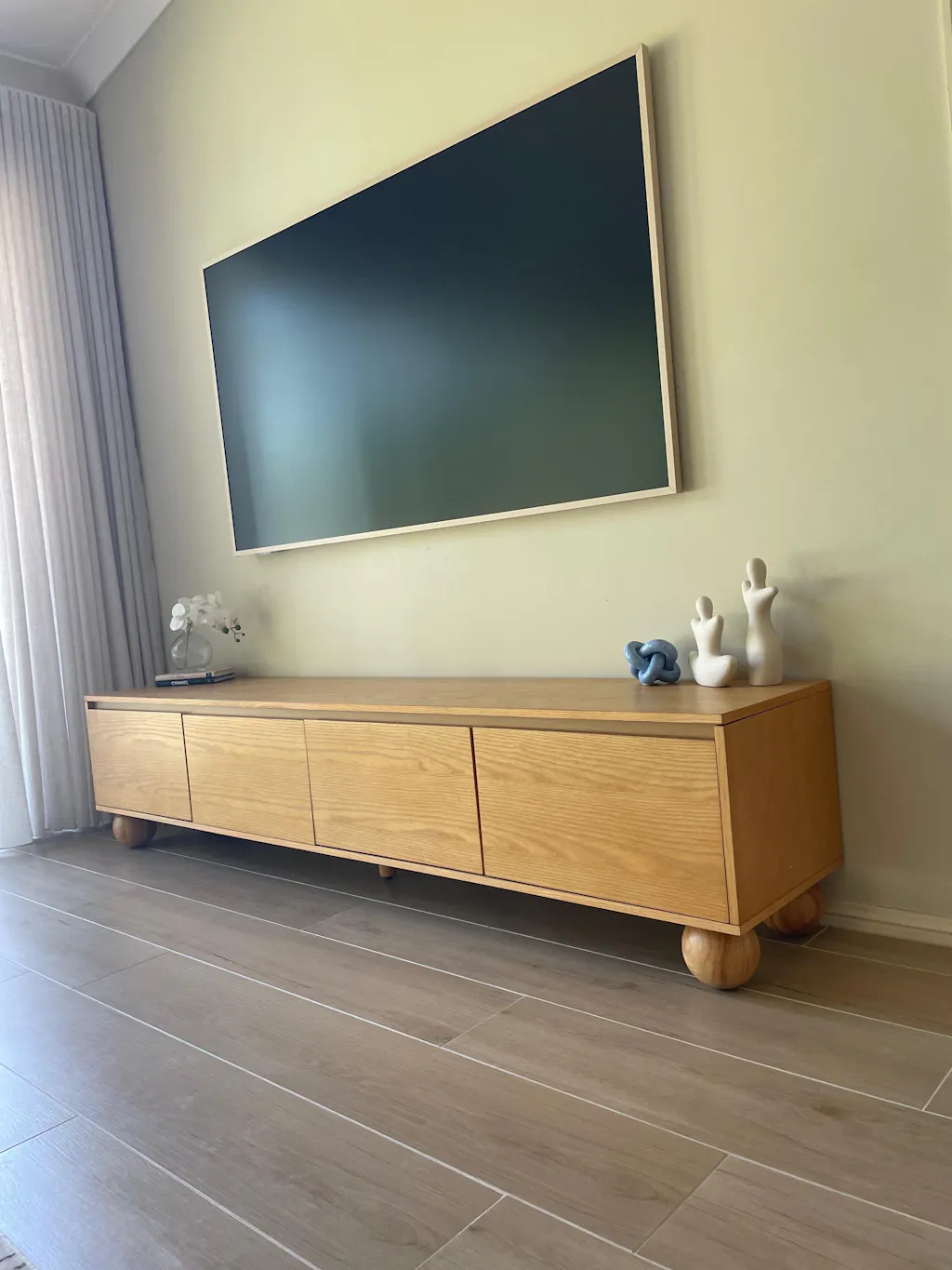 The Ballico TV Unit features distinctive ball-shaped legs that draw inspiration from Japandi design principles. These legs, crafted from robust rubberwood, merge the minimalistic approach of Japanese design with the warmth of Scandinavian style, offering stability and a unique, refined aesthetic.