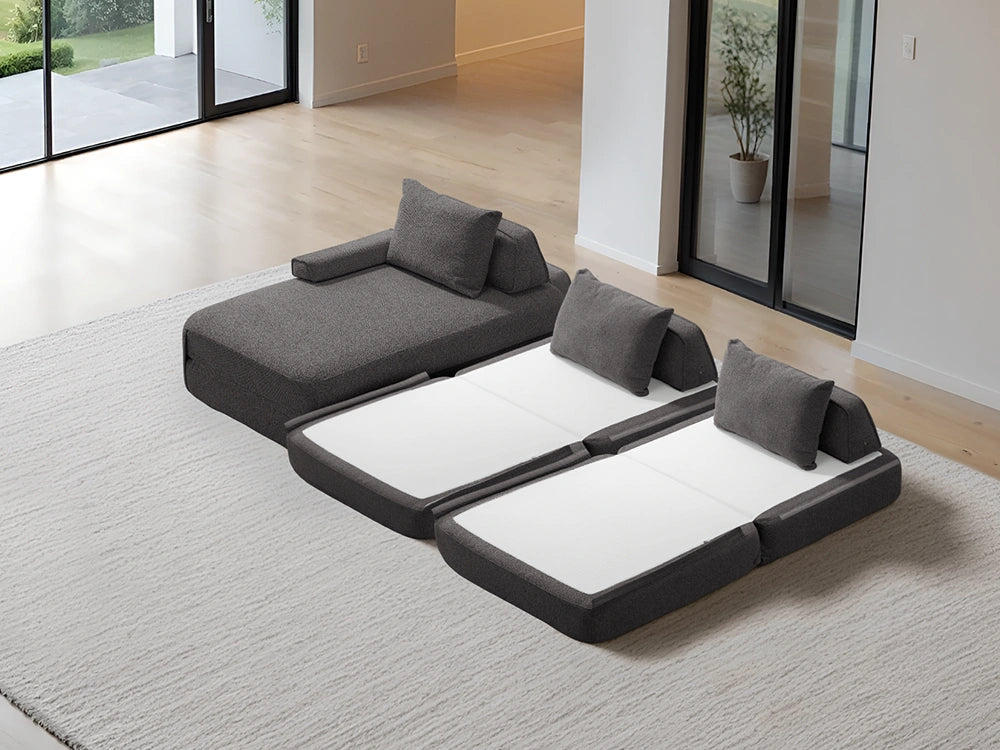 Cushie Modular Sofa Bed transforms from a stylish seat to a cozy bed in seconds—just flip and snooze. Unlike traditional sleeper sofas with noisy metal frames and complex pull-outs, Cushie keeps it simple and silent.