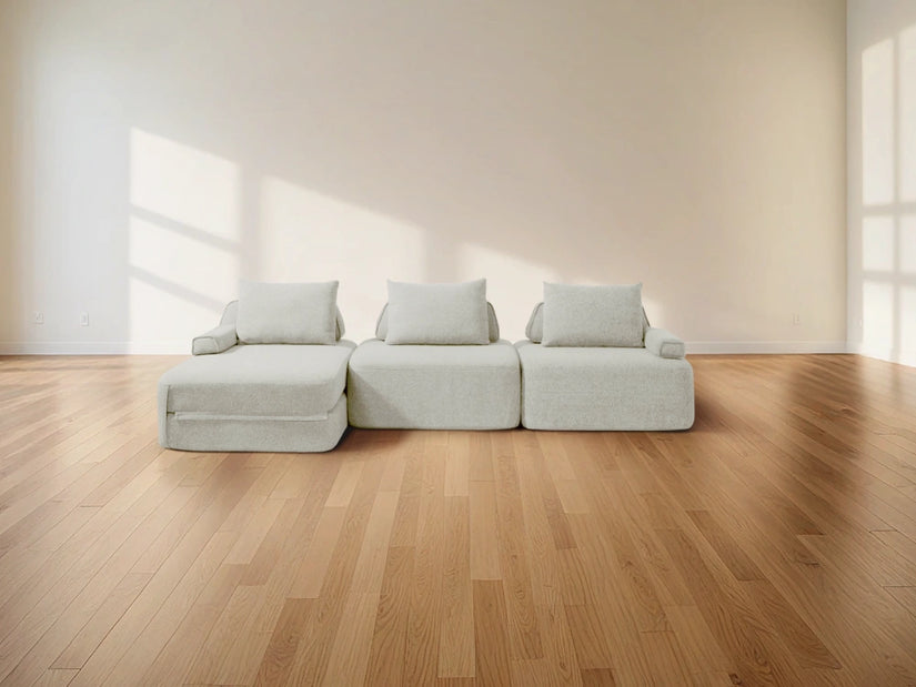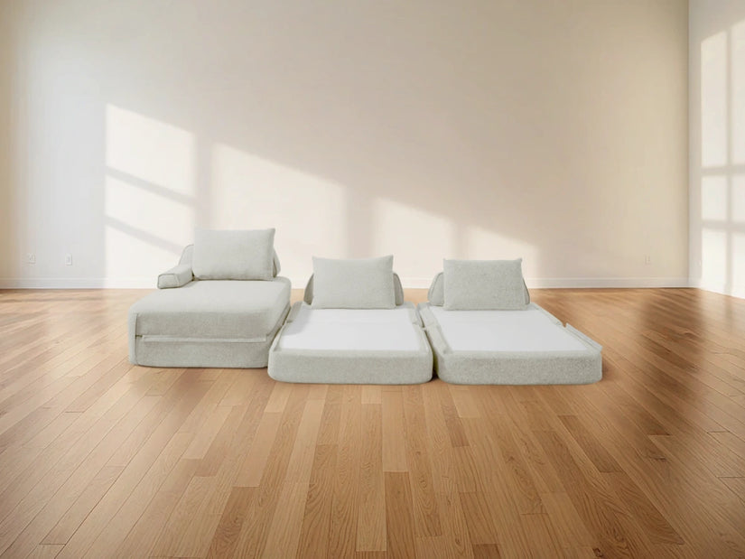 Cushie Modular Sofa Bed transforms from a stylish seat to a cozy bed in seconds—just flip and snooze. Unlike traditional sleeper sofas with noisy metal frames and complex pull-outs, Cushie keeps it simple and silent.