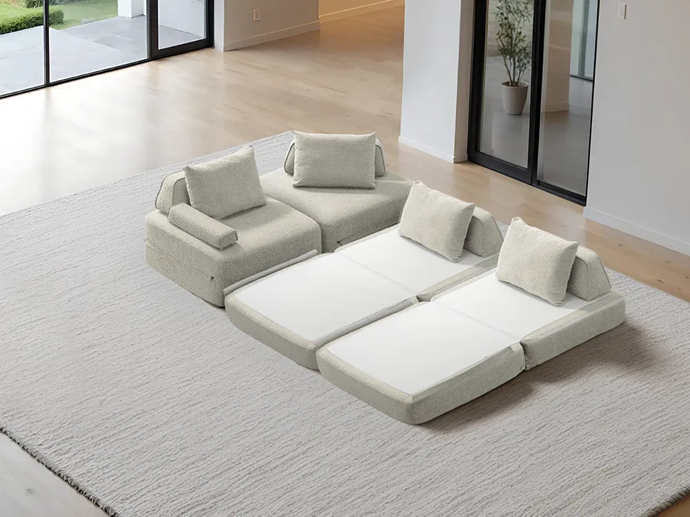 Cushie Modular Sofa Bed transforms from a stylish seat to a cozy bed in seconds—just flip and snooze. Unlike traditional sleeper sofas with noisy metal frames and complex pull-outs, Cushie keeps it simple and silent.