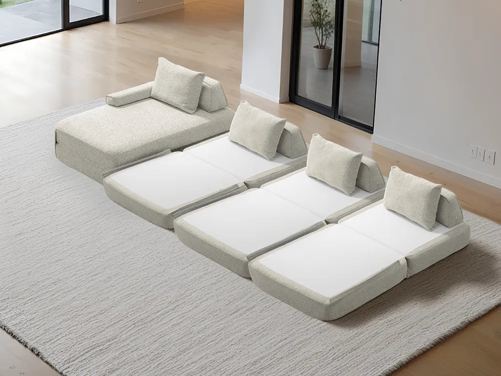Cushie Modular Sofa Bed transforms from a stylish seat to a cozy bed in seconds—just flip and snooze. Unlike traditional sleeper sofas with noisy metal frames and complex pull-outs, Cushie keeps it simple and silent.