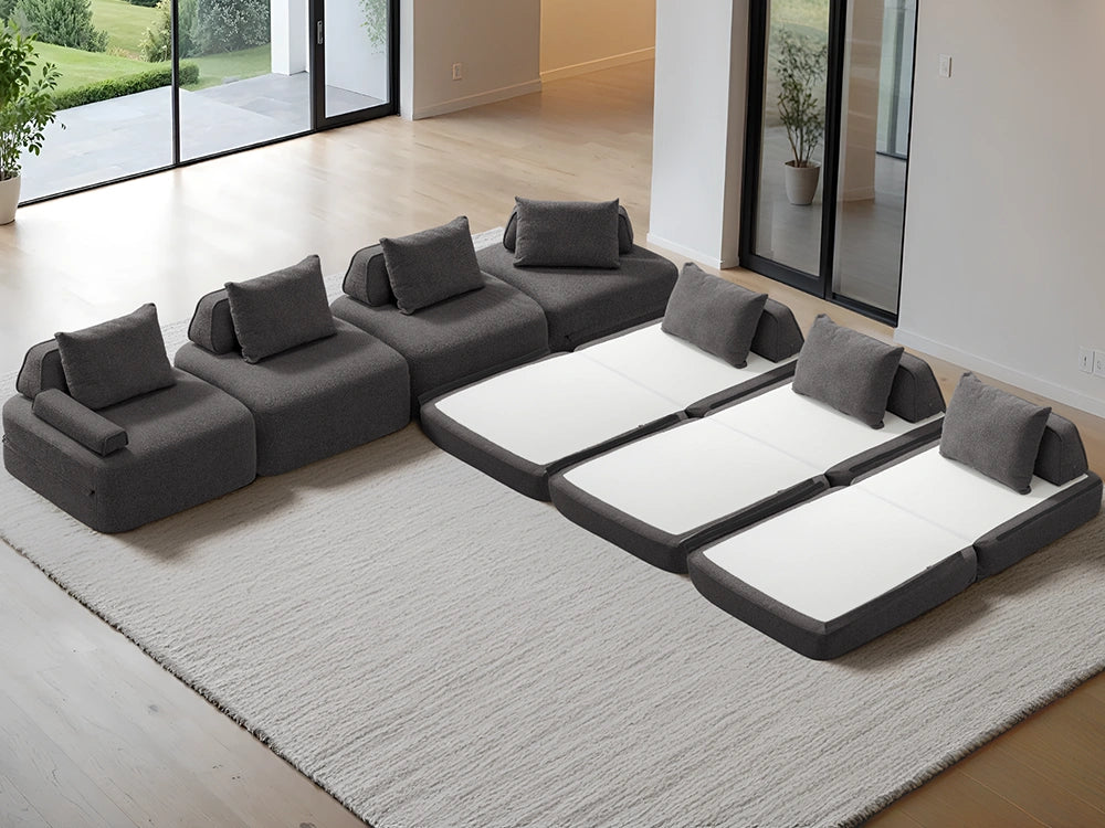 Cushie Modular Sofa Bed transforms from a stylish seat to a cozy bed in seconds—just flip and snooze. Unlike traditional sleeper sofas with noisy metal frames and complex pull-outs, Cushie keeps it simple and silent.