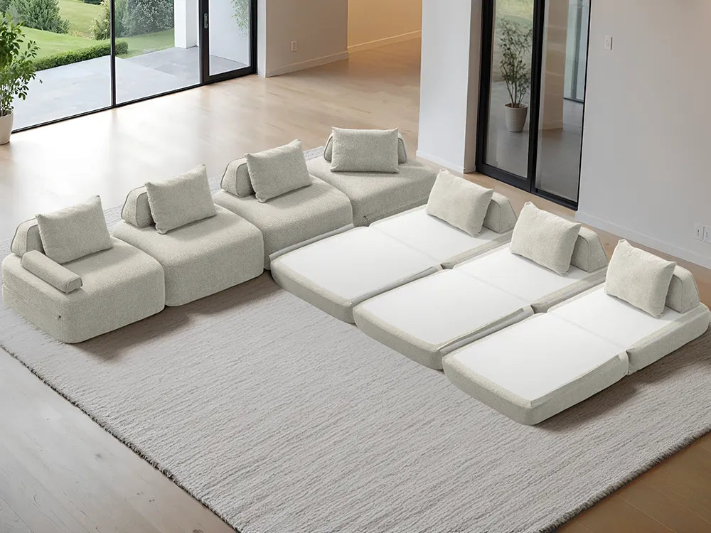 Cushie Modular Sofa Bed transforms from a stylish seat to a cozy bed in seconds—just flip and snooze. Unlike traditional sleeper sofas with noisy metal frames and complex pull-outs, Cushie keeps it simple and silent.