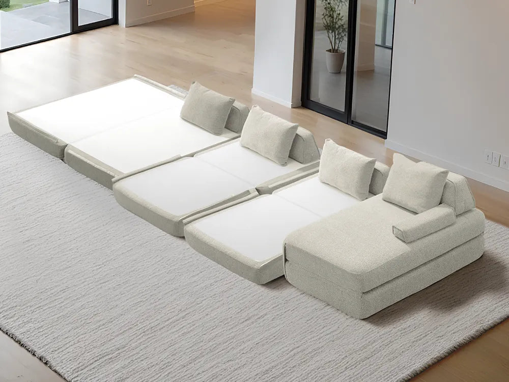 Cushie Modular Sofa Bed transforms from a stylish seat to a cozy bed in seconds—just flip and snooze. Unlike traditional sleeper sofas with noisy metal frames and complex pull-outs, Cushie keeps it simple and silent.