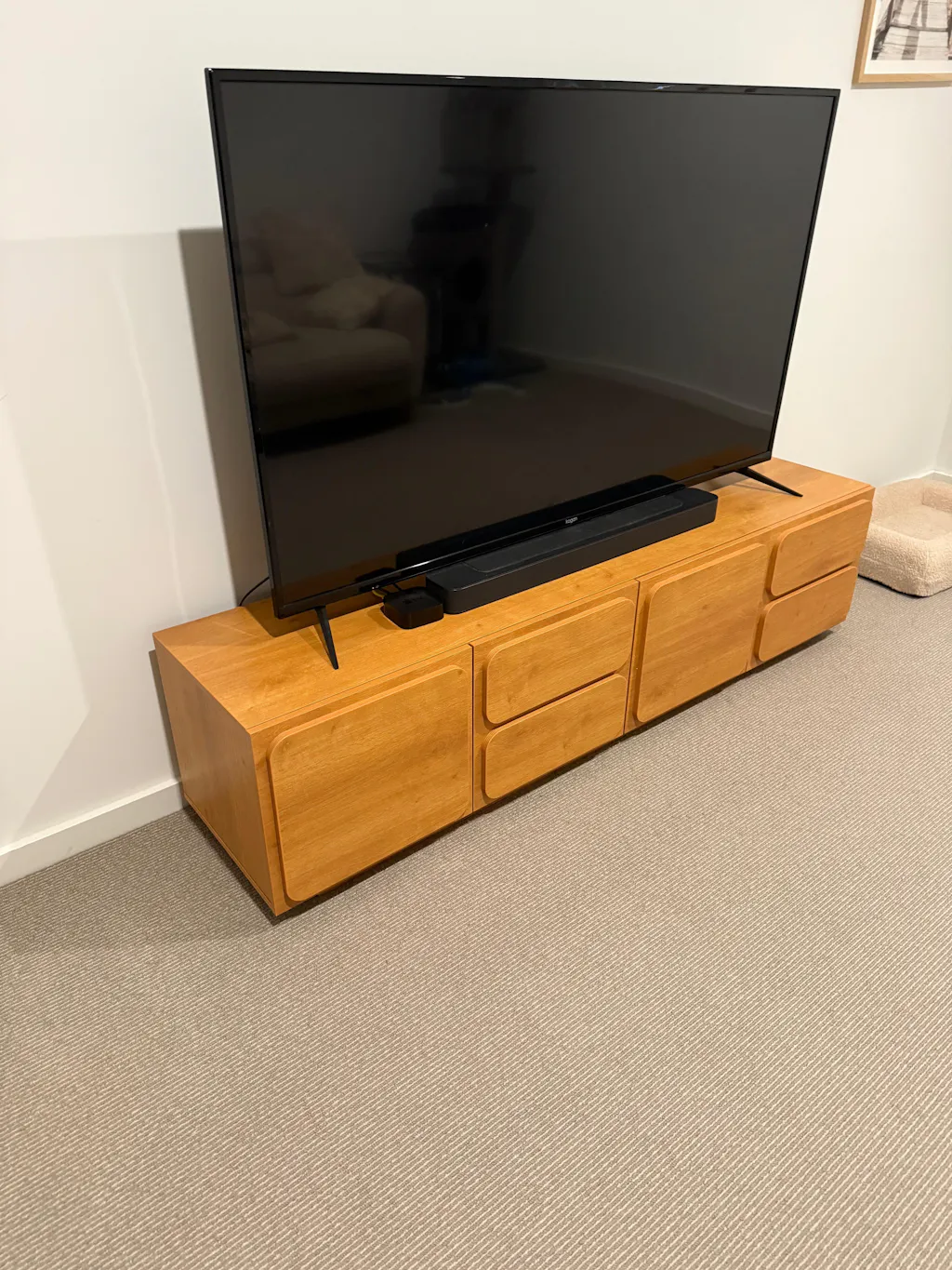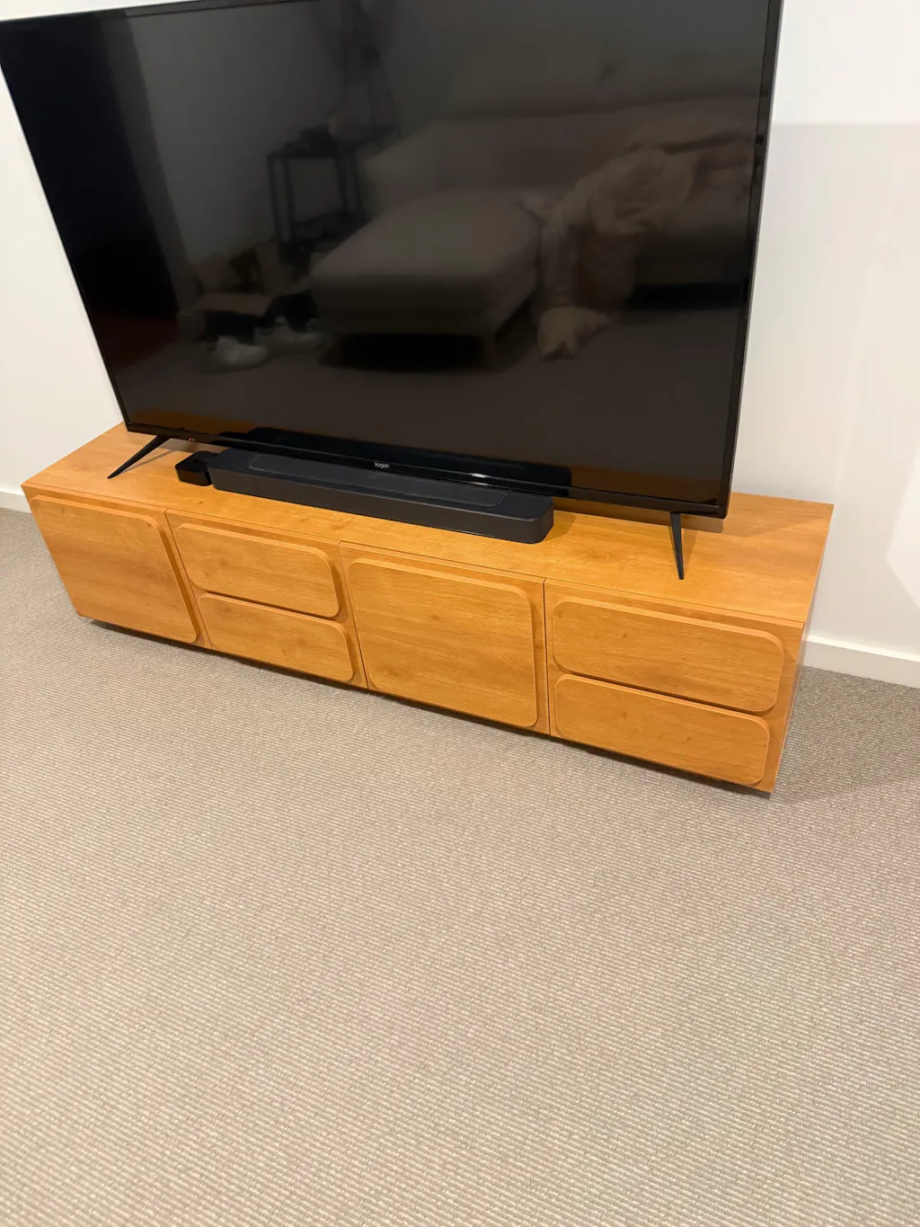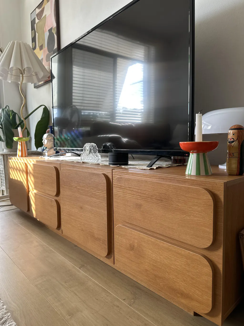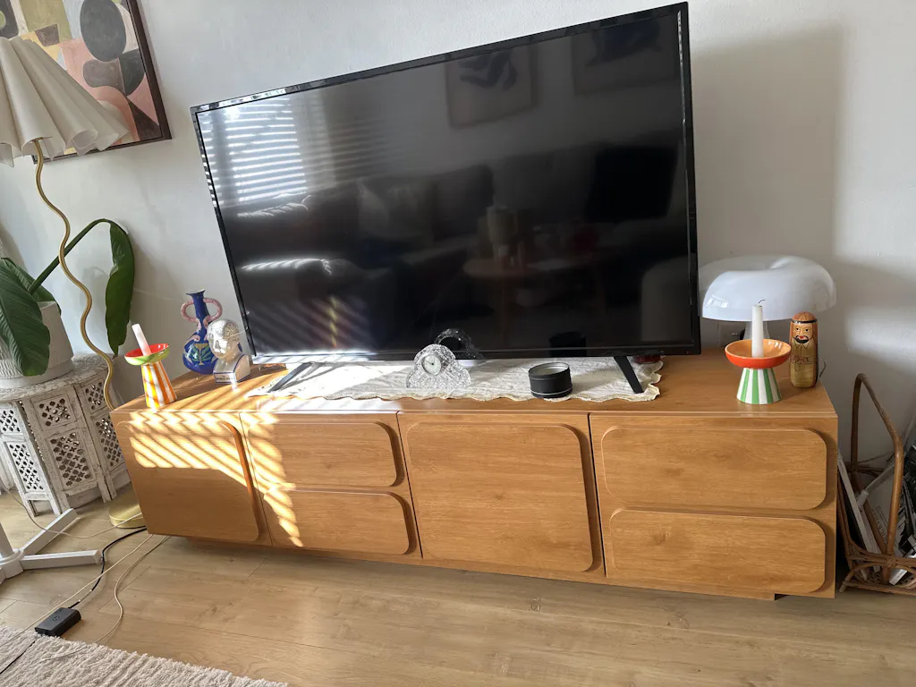 Designed with a slightly elevated base, this TV unit creates a floating effect that enhances the sense of space in your living room. The subtle lift not only adds a modern aesthetic but also improves air circulation beneath the unit, preventing dust accumulation.