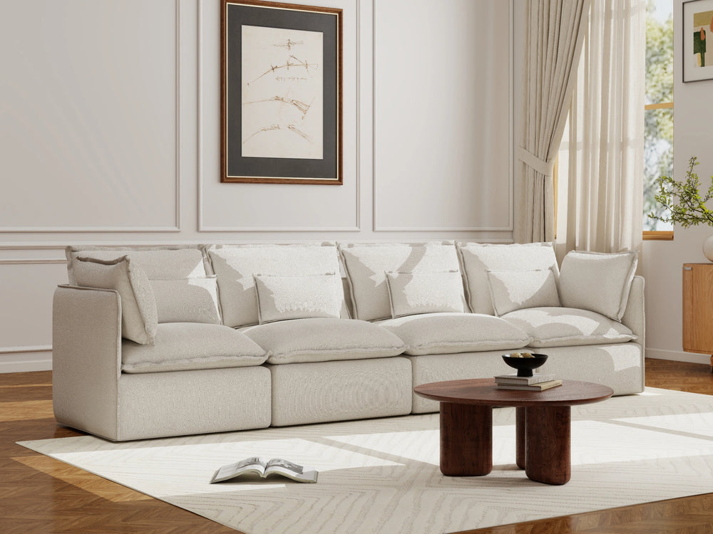 I originally got the 4 seater, I’ve since added two more seats and 2 ottomans. I have 2 toddlers and a dog (and a tradie) AND the white version and I am super impressed with the way it spot cleans. I’ve gotten pen, raspberry and chocolate off without having to wash it in the machine. The pillows get softer everytime we sit on it and it’s firm enough that it has decent support in the back. I hope they bring out more colours! Maybe boucle grey?? Or a chocolate! It has not disappointed me yet!