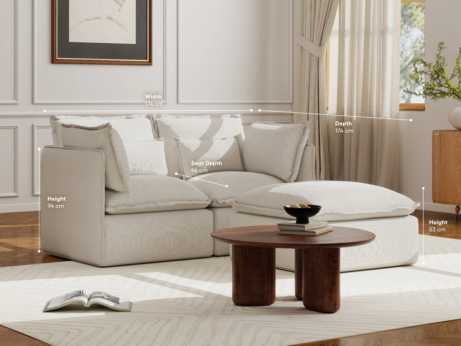 Ottoman: 86W x 86D x 51H (cm)
