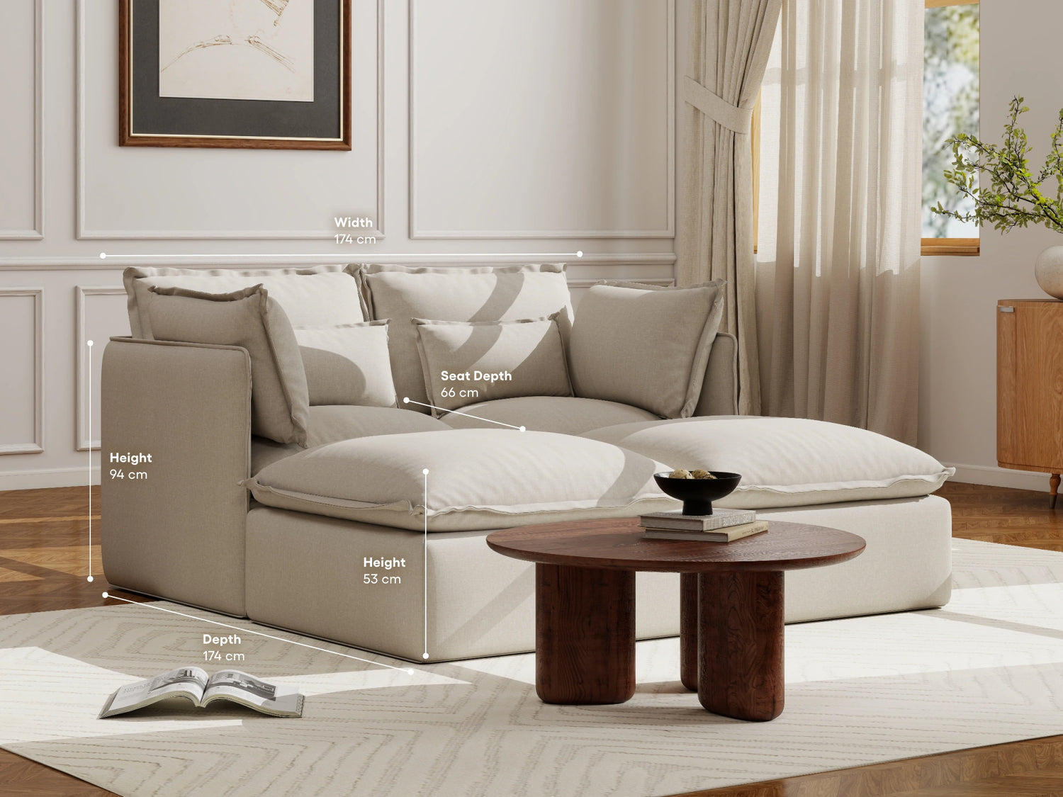 I originally got the 4 seater, I’ve since added two more seats and 2 ottomans. I have 2 toddlers and a dog (and a tradie) AND the white version and I am super impressed with the way it spot cleans. I’ve gotten pen, raspberry and chocolate off without having to wash it in the machine. The pillows get softer everytime we sit on it and it’s firm enough that it has decent support in the back. I hope they bring out more colours! Maybe boucle grey?? Or a chocolate! It has not disappointed me yet!