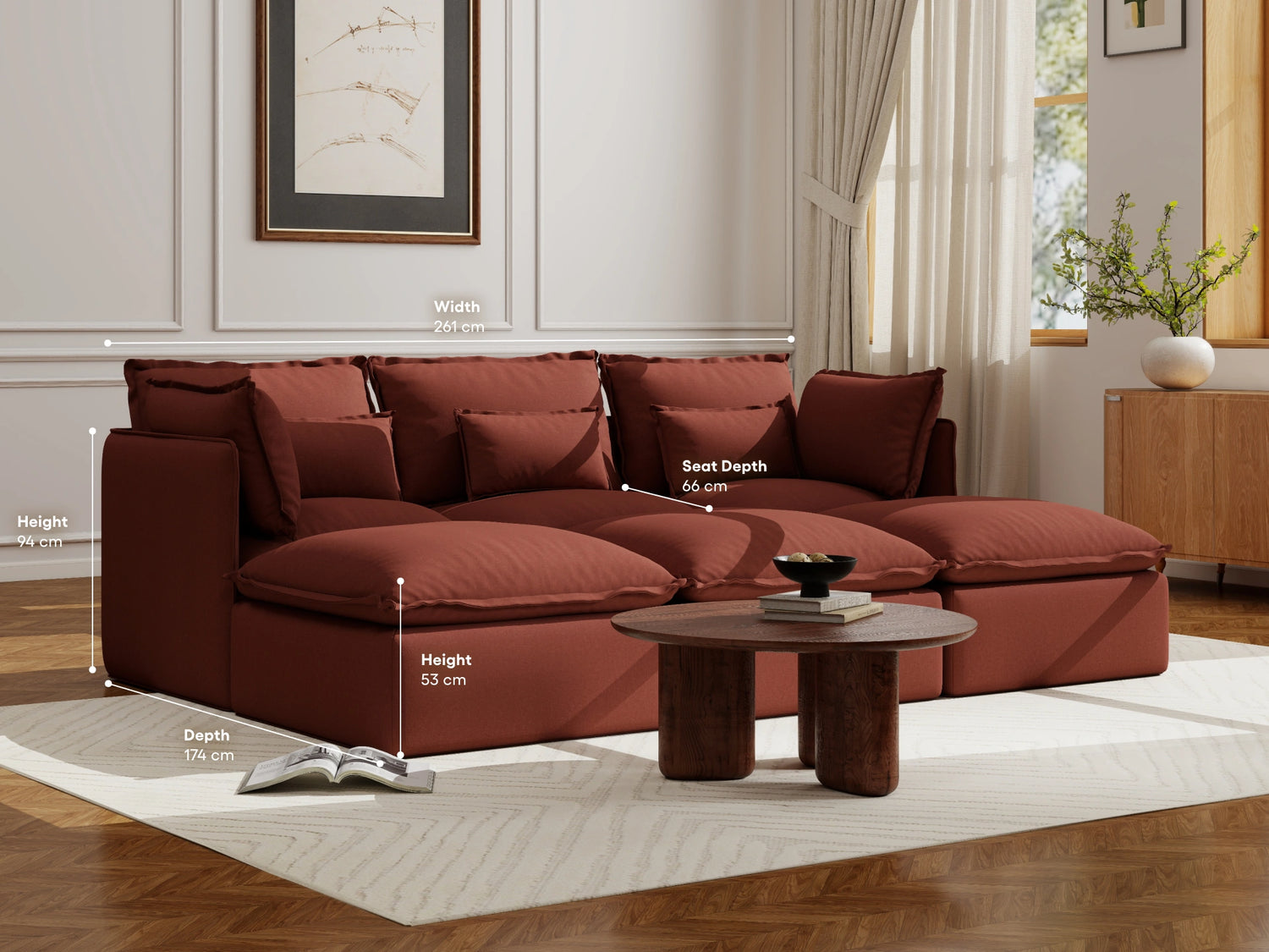 I originally got the 4 seater, I’ve since added two more seats and 2 ottomans. I have 2 toddlers and a dog (and a tradie) AND the white version and I am super impressed with the way it spot cleans. I’ve gotten pen, raspberry and chocolate off without having to wash it in the machine. The pillows get softer everytime we sit on it and it’s firm enough that it has decent support in the back. I hope they bring out more colours! Maybe boucle grey?? Or a chocolate! It has not disappointed me yet!