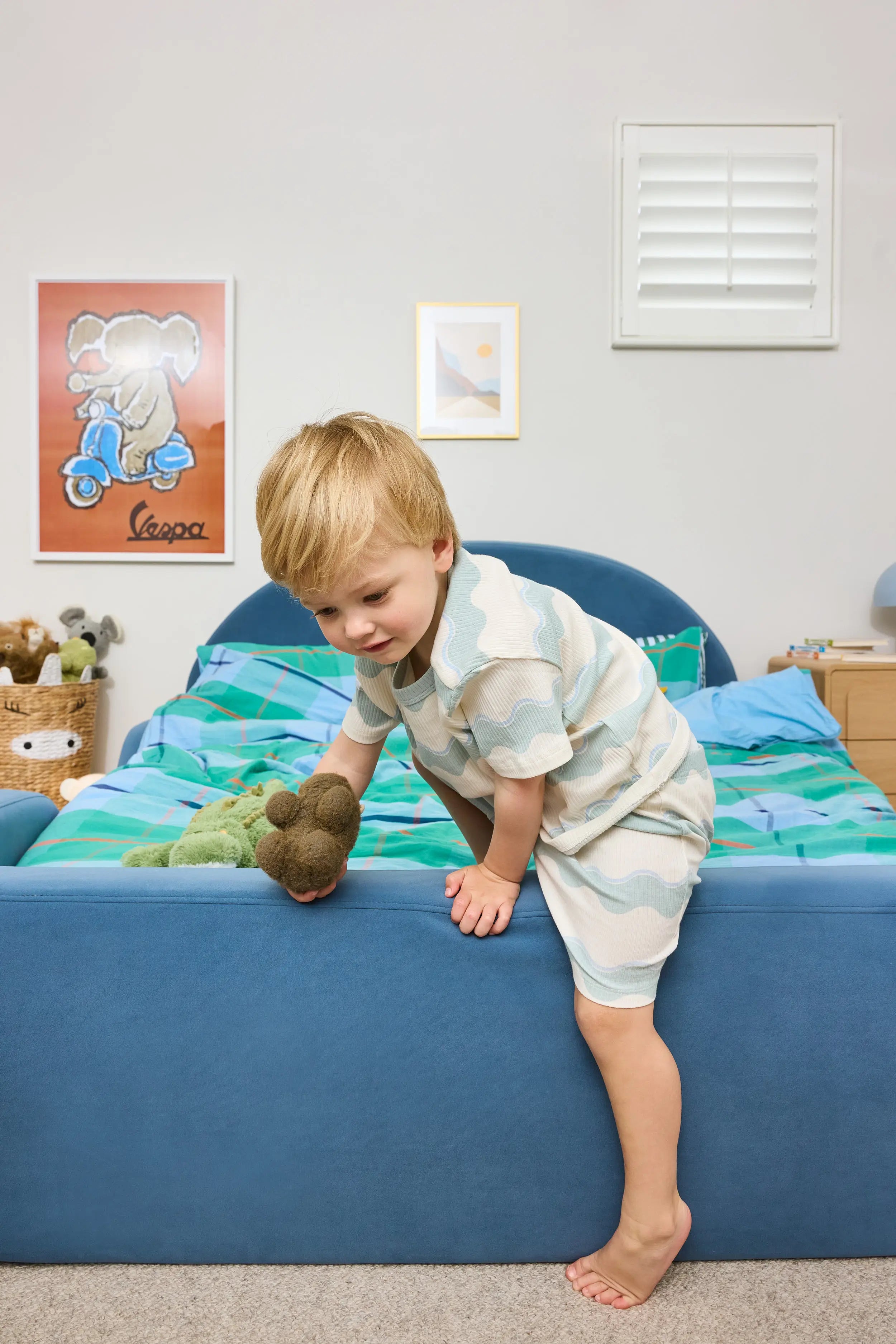 Built for Big Dreams & Little Accidents. Meet the bed that understands real life with real kids. Designed with soft, rounded edges and zero hard materials, the Little Lifely Double Bed (Dusty Blue) keeps bumps, bruises, and bedtime stress at bay. Its low-to-the-ground design makes it perfect for toddlers learning independence — without compromising on safety.