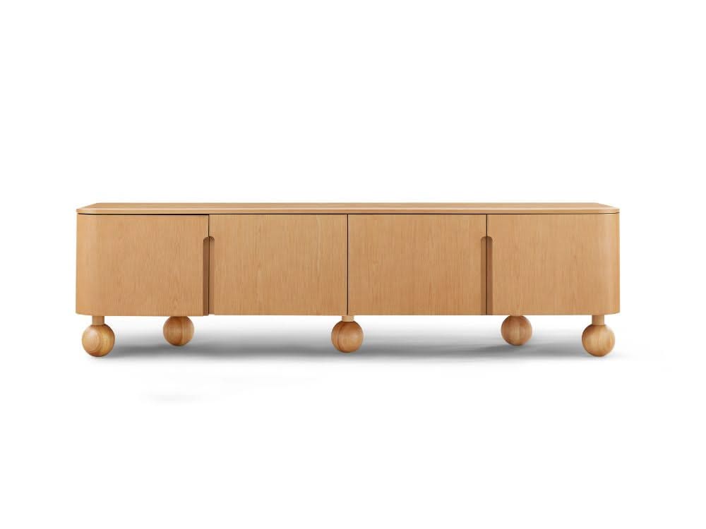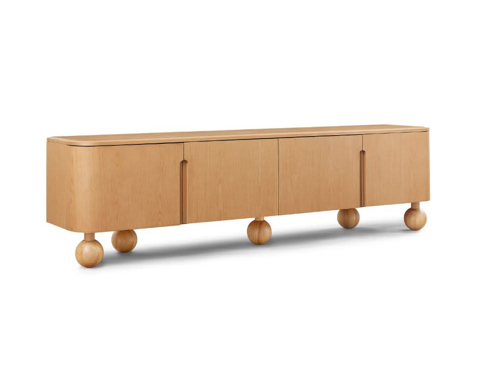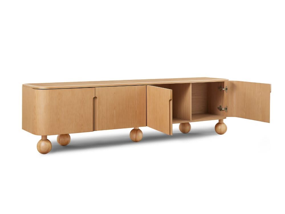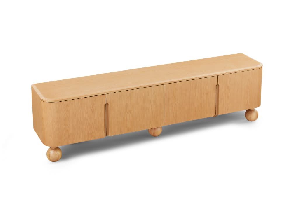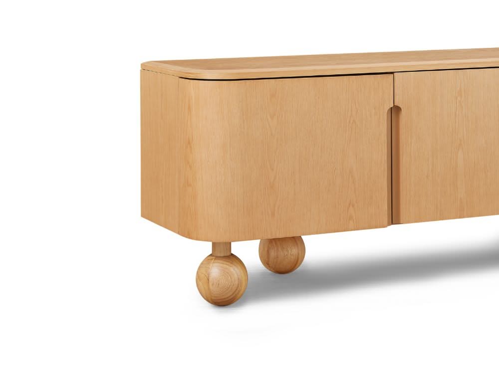 A seamless blend of functionality and sculptural elegance, the Theo TV Unit embodies the essence of Japandi Contemporary design—where organic warmth meets modern simplicity. Crafted with a streamlined silhouette, it features softly rounded edges that exude a sense of balance and tranquility. The bold, rounded legs, made from solid wood, introduce an artful, sculptural appeal while ensuring lasting durability. Behind its sleek facade, spacious storage cabinets provide a discreet yet ample solution for organizing electronics, books, and everyday essentials, complete with integrated cable management to maintain a clean, uncluttered aesthetic. The Theo TV Unit is a sophisticated statement piece, harmonizing natural textures with contemporary form for a home that feels effortlessly refined.