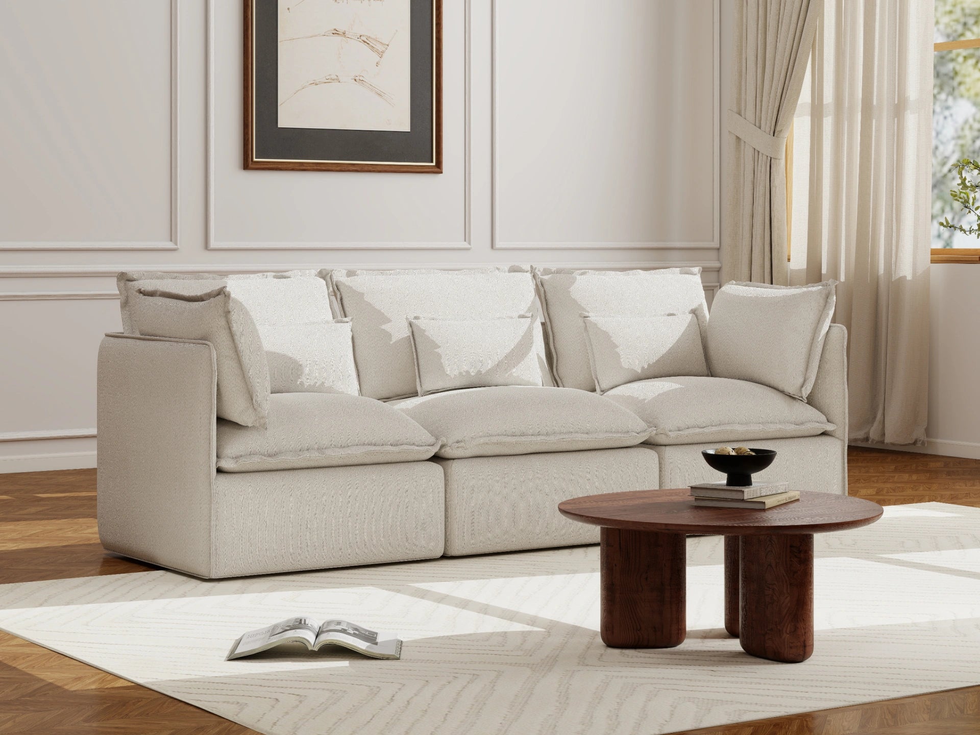 I originally got the 4 seater, I’ve since added two more seats and 2 ottomans. I have 2 toddlers and a dog (and a tradie) AND the white version and I am super impressed with the way it spot cleans. I’ve gotten pen, raspberry and chocolate off without having to wash it in the machine. The pillows get softer everytime we sit on it and it’s firm enough that it has decent support in the back. I hope they bring out more colours! Maybe boucle grey?? Or a chocolate! It has not disappointed me yet!